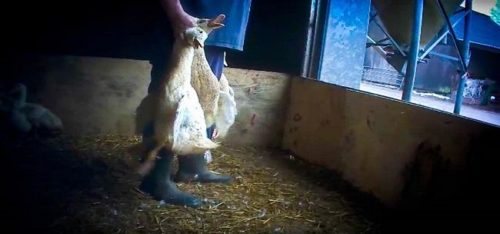 En medio de un ruido ensordecedor y en completo estado de pánico los patos son capturados violentamente mientras los apilan en cajas para ser transportados en un camión que va directo al matadero.