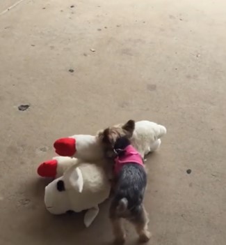 This tiny dog picked out the biggest toy in the store — and she's carrying it to the car ALL BY HERSELF.